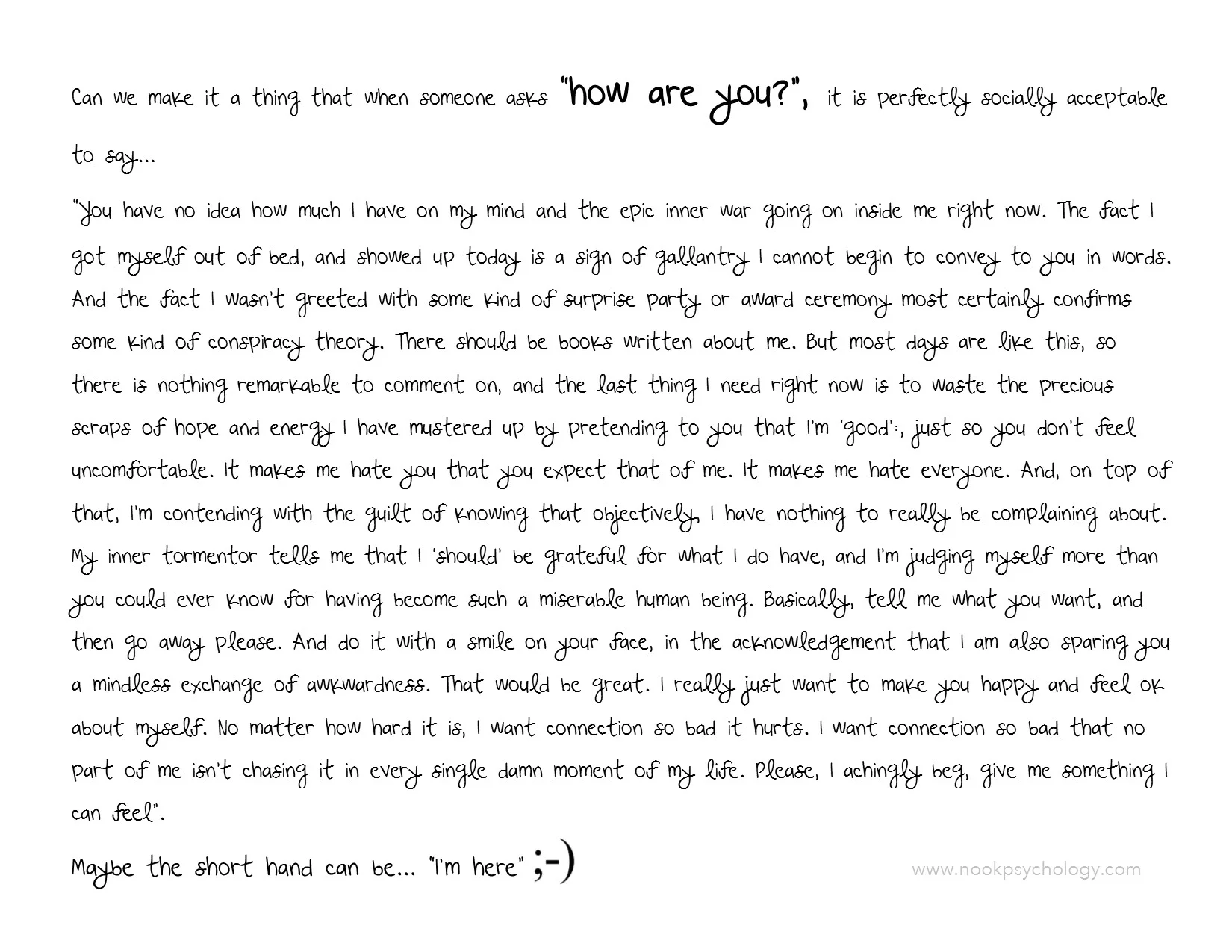So, maybe you will decide to take yourself off to therapy, or maybe you would prefer to work on things yourself. Either way, any anxiety can be armed with the ability to speak for parts. Whether it's the psychologist or the checkout guy at the supermarket who asks “…and how are you today?”, instead of a small meltdown when considering which part to answer from, you can find comfort in the fact that any answer you choose doesn’t have to represent the totality of who you are, or capture every element of your experience; you are simply speaking for the most present part in the moment. If more people in everyday life became comfortable talking for parts, I think the world would naturally begin to make a lot more sense to everyone. But if you're considering making an appointment to talk to a psychologist, do your research, choose someone you like the sound of, take them for a test drive to see if it feels like a good match, and most importantly... enjoy the ride.